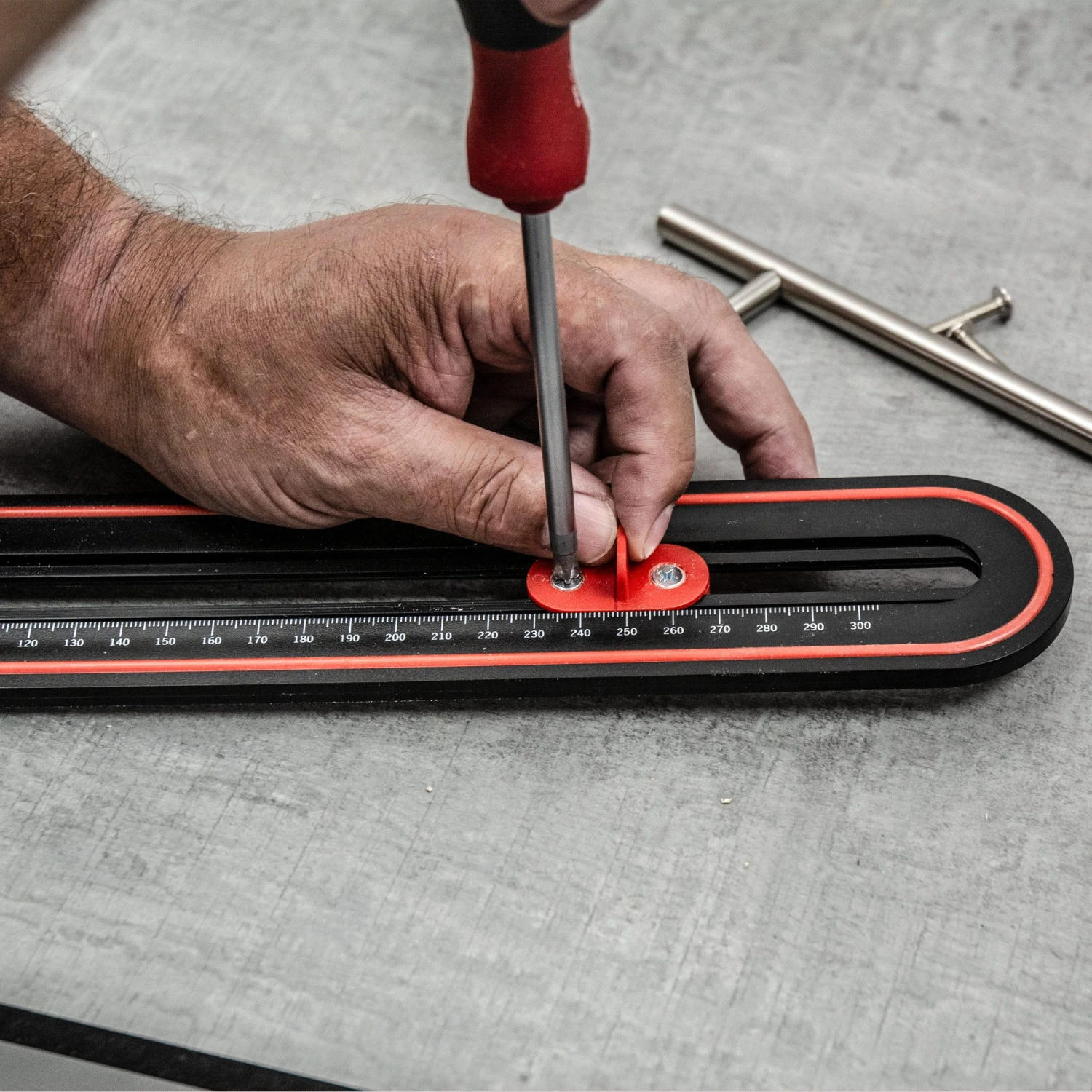 A versatile drilling/marking jig that assists in the accurate and repetitive installation of cabinetry handles and knobs on a wide variety of door and drawer fronts.