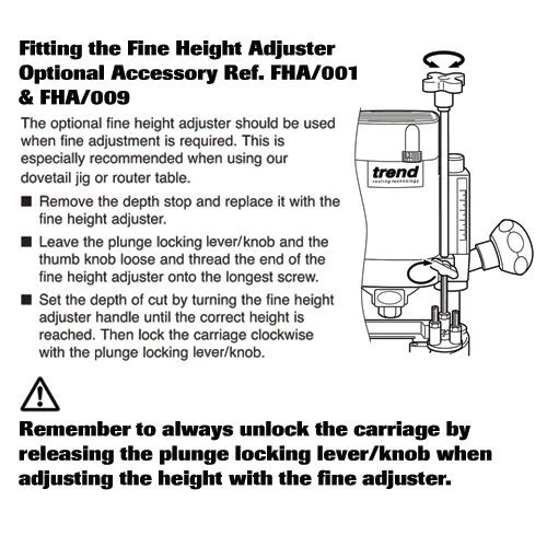 This fine height adjuster simply fits onto the router and allows fine adjustment of the cutter height.