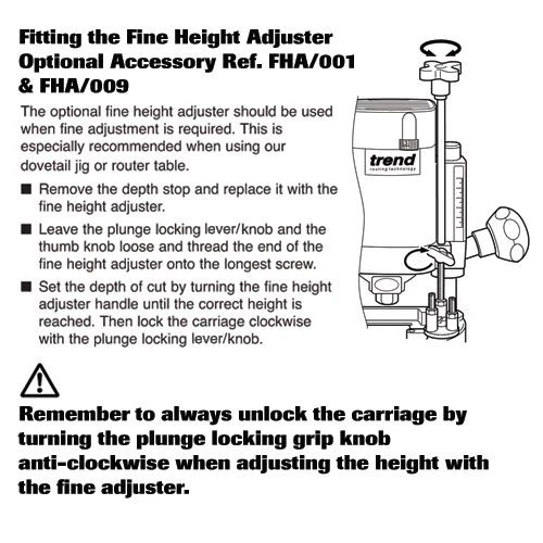 This fine height adjuster simply fits onto the router and allows fine adjustment of the cutter height.