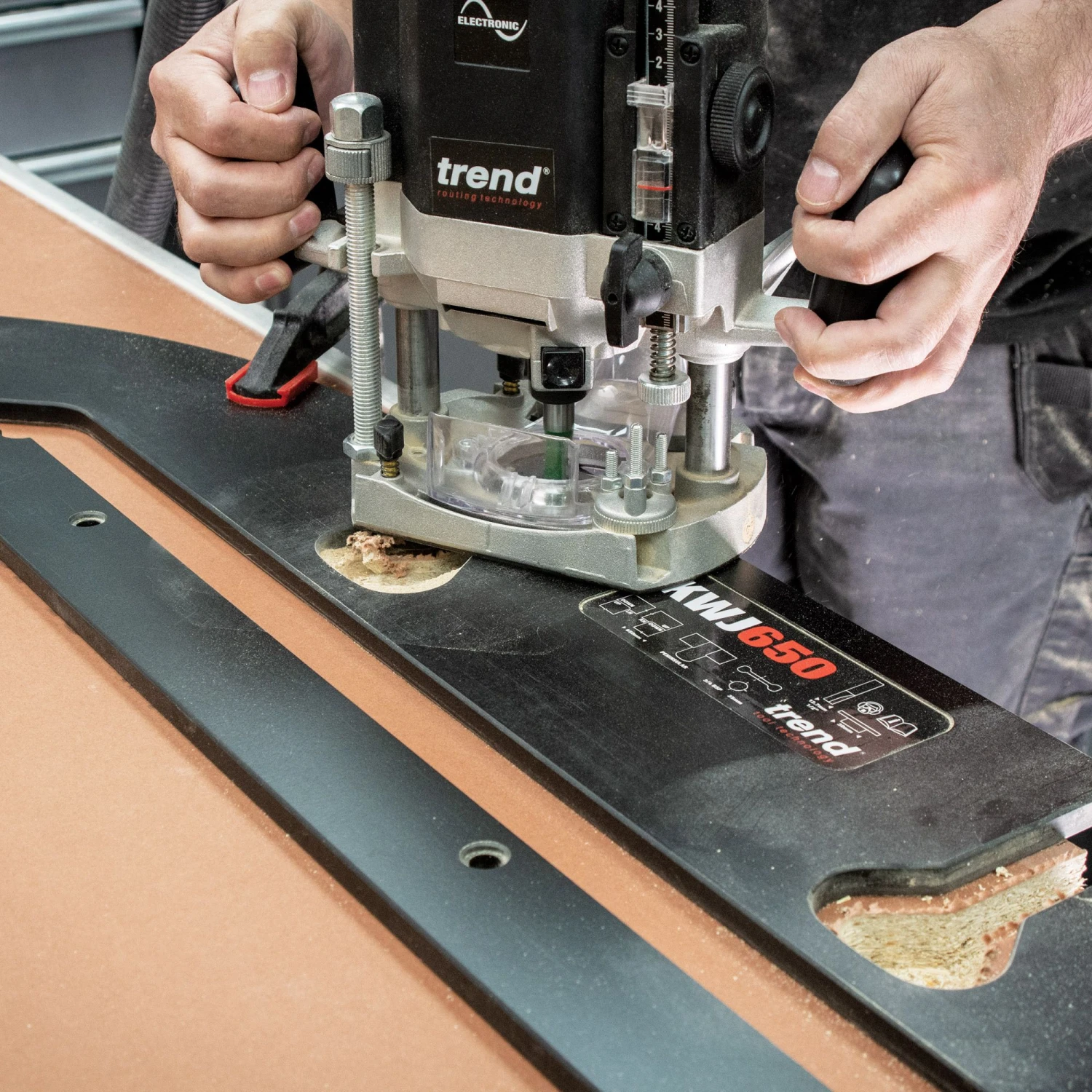 - Cuts up to 40mm thick worktops with or without anti-drip postformed edge.