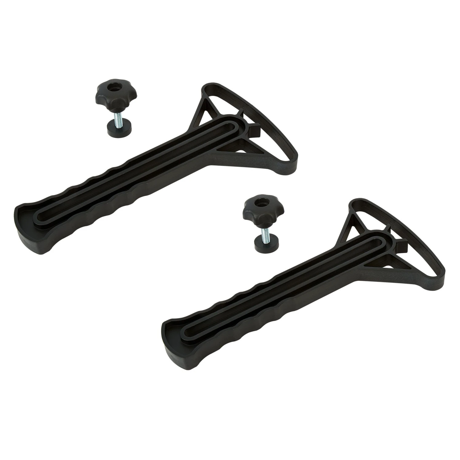 A pair of down pressures that fit directly to the backfence. They maintain downward pressure when edge profiling or grooving.